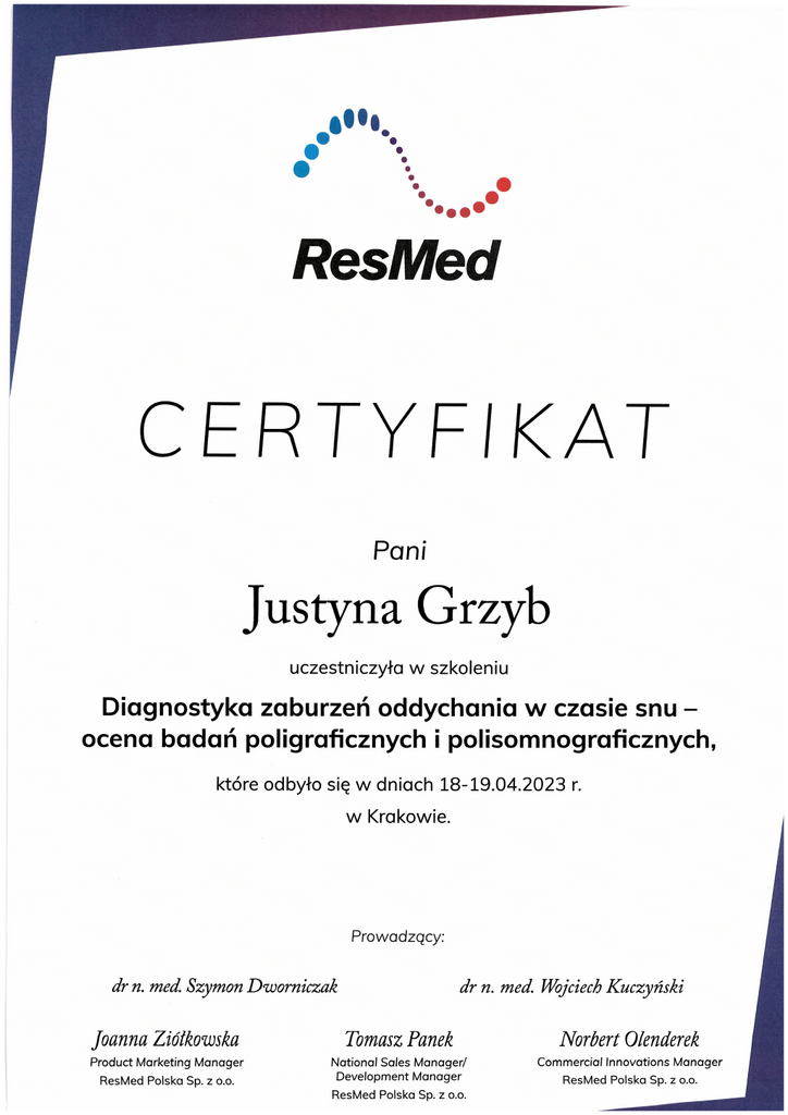 Lekarz opracowujący/opisujący wyniki – dr n. med. Karolina Simionescu – specjalista kardiolog (pracuje w Oddziale Elektrokardiologii Szpitala Klinicznego nr 7 Górnośląskiego Centrum Medycznego ŚUM w Katowicach Ochojcu oraz w Klinice Elektrokardiologii i Niewydolności Serca Katedry Elektrokardiologii ŚUM, gdzie prowadzi działalność naukowo-dydaktyczną. Członek Polskiego Towarzystwa Kardiologicznego Sekcji Echokardiografii, Sekcji Niewydolności Serca oraz Sekcji Rytmu Serca. Specjalizuje się w nieinwazyjnej diagnostyce i leczeniu chorób krążenia w tym zaburzeń oddychania w czasie snu u chorych ze schorzeniami kardiologicznymi oraz opiece nad pacjentami z wszczepionymi urządzeniami).