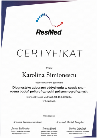 Lekarz opracowujący/opisujący wyniki – dr n. med. Karolina Simionescu – specjalista kardiolog (pracuje w Oddziale Elektrokardiologii Szpitala Klinicznego nr 7 Górnośląskiego Centrum Medycznego ŚUM w Katowicach Ochojcu oraz w Klinice Elektrokardiologii i Niewydolności Serca Katedry Elektrokardiologii ŚUM, gdzie prowadzi działalność naukowo-dydaktyczną. Członek Polskiego Towarzystwa Kardiologicznego Sekcji Echokardiografii, Sekcji Niewydolności Serca oraz Sekcji Rytmu Serca. Specjalizuje się w nieinwazyjnej diagnostyce i leczeniu chorób krążenia w tym zaburzeń oddychania w czasie snu u chorych ze schorzeniami kardiologicznymi oraz opiece nad pacjentami z wszczepionymi urządzeniami).